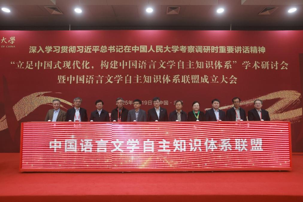 中国人民大学校长林尚立、中国社会科学院文学研究所所长丁国旗、清华大学中文系主任周绚隆、北京师范大学文学院副院长张莉、南京大学文学院院长董晓、四川大学文学与新闻学院院长罗鹭、山东大学文学院院长黄发有、浙江大学文学院院长冯国栋、武汉大学文学院院长于亭、南开大学文学院院长李锡龙、中国人民大学文学院院长陈剑澜等联盟成员单位代表共同宣布“中国语言文学自主知识体系联盟”正式成立。陈剑澜宣读联盟倡议书。