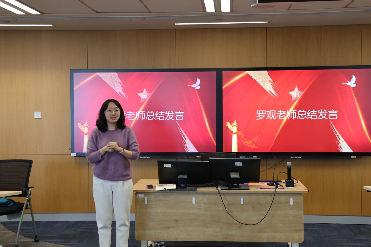 最后,罗观老师对支部党员同学的发言做了总结。她认为,同学们结合《讲话》精神和自身专业实践,围绕三个议题进行了充分的交流讨论,对文艺的人民性、时代性和党性原则都有独到的思考,能够深刻理解习近平文化思想明体达用、体用贯通的理论品格。同时,她希望同学们作为文学院的研究生,能坚持践行党员初心使命,在守正创新中勇担时代使命,用实际行动推动新时代文艺事业繁荣发展。