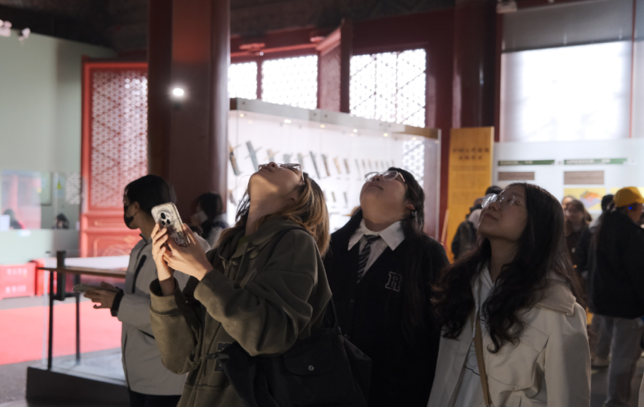 先农坛太岁殿内,在被誉为“稀世国宝”的国家一级文物“星空藻井”下,大家纷纷驻足观赏,惊叹于古人的智慧与匠心。藻井整体呈金黄色,自上而下共分为六层,层层天宫直达星河,每一层都精雕细琢,云纹雕饰与框架结构交相辉映,展现出极高的艺术造诣。