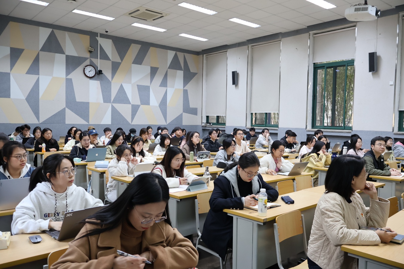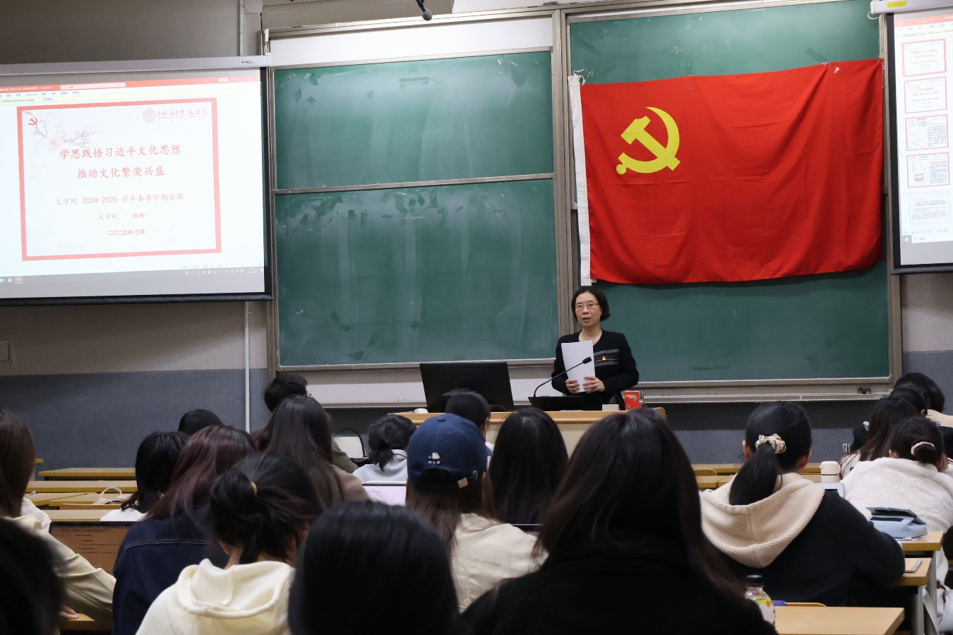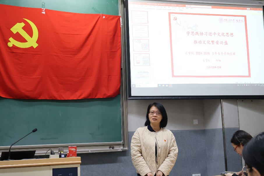 3月26日下午,中国人民大学文学院党委第21期入党积极分子培训班首场党课在公共教学二楼2101教室开讲。文学院党委书记颜梅以“学思践悟习近平文化思想,推动文化繁荣兴盛”为主题授课,文学院党委副书记康凤主持,本期培训班67名入党积极分子参加学习。