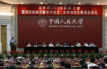 2009年9月13日晚6:30,文学院2009迎新大会暨第四届谢无量学术论文、文学创作大赛颁奖典礼在逸夫会议中心第一报告厅隆重举行。学校副校长杨慧林教授、文学院院长孙郁教授、党委书记王贵元教授,副院长贺阳,张永青,耿幼壮,党委副书记王林英,教授代表李炳海,刘小枫等出席,文学院教师代表,全体2009级本硕博及留学生新生共计300人参加大会。
