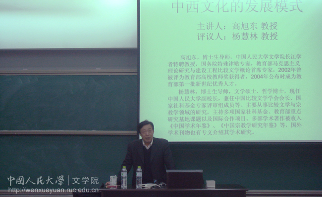 高旭东教授主要从三个方面论述了中西方文化的发展差异。首先是中国文化的早熟与西方文化的正常发展。西方文化以希腊文化为发端,是人类文明的童年,此后的文明沿着她的足迹,完成了由神话、宗教到现实的过程。中国文化往往表现为早熟,如孔孟思想,老庄哲学,没有像西方对于神话世界的强烈追求。高教授从艺术、诗歌、科学、哲学等几个方面来阐述其发展的差异。其次介绍了中西方文化的特点,以中国文化的连续性、稳定性、承传性对比西方文化的批判性、否定性、跳跃性;再次从历史的角度看,西方文化是进步发展的直线,而中国文化如同循环往复的圆圈,并生动地以鲁迅笔下阿Q画圆的隐喻方式来解释中国文化中的循环性。最后,高旭东教授评估了这两种文化的发展模式。